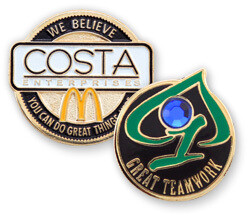 Employee recognition award pins can be created several different ways. They can be soft enamel, cloisonee, die struck or offset printed. They can be a standard shape or cut-to-shape for distinction. Many employers have a tiered award program so they like to use simulated gemstones to differentiate between accomplishments. For example, someone that has been with the company for fifty years receives a lapel pin with a simulated diamond in it while someone that has been with the company for twenty years receives one with a simulated ruby in it. This keeps employees working together to remain motivated year after year.
