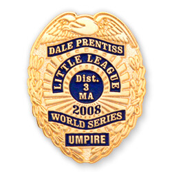 Umpire pins honor Little League officials. They can be shaped, die struck, soft enamel or cloisonné. Each style of pin is special and memorable. Based on your specifications, we will determine which will work best with your design.