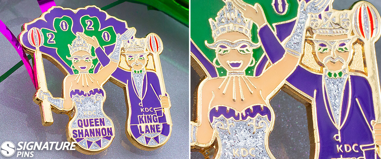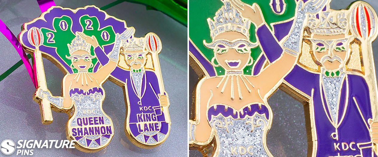 This year’s king and queen, Lane and Shannon, decided that a fun pin design featuring a taste of the elaborate Mardi Gras garb guests can expect to see at this year’s celebration was the perfect commemorative item to give away at the club’s event. The white glitter enamel gives the artwork a festive dazzling effect.