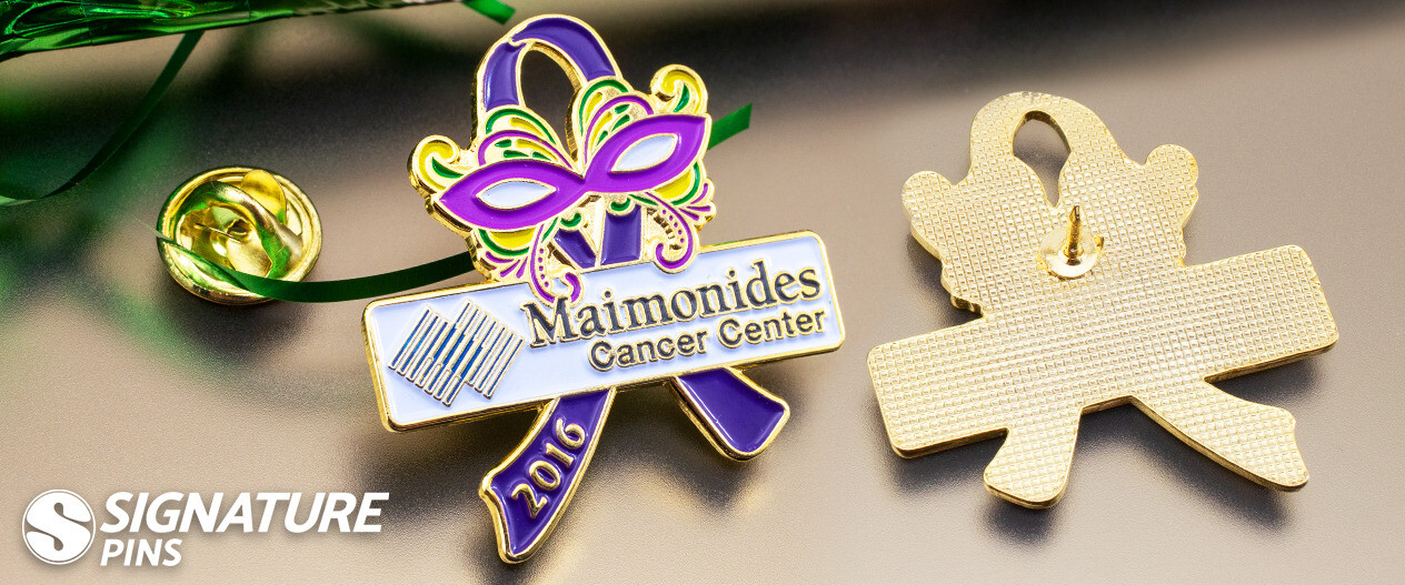 This soft enamel awareness ribbon pin is one of our all-time favorite Mardi Gras inspired designs. It was created for the Maimonides Cancer Center, which is the only full-service cancer center in Brooklyn, New York. Over the years, the center has brought together specialists who can diagnose and treat almost every kind of cancer there is, giving patients more than a fighting chance in their efforts to beat cancer.