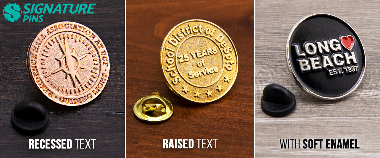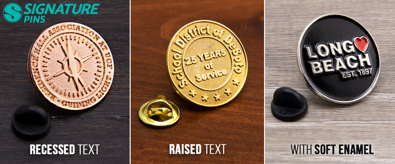 The latter option will always provide the most legible text. To help add contrast to a design, it’s a good idea to consider adding color to the recessed portion around the text. This will help the text stand out even more so no one will have to squint or put their pin under a bright light to read the message.