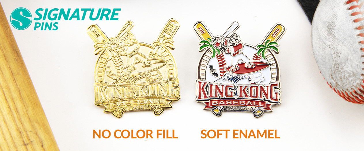 Offering the same design in a different style is another great way to increase the tradability of your team’s pins by adding a little variety. A majority of the softball and baseball pins we help create are soft enamel pins, but some of our customers ask for a set of companion die struck pins with their order. Since die struck trading pins are less common, their rarity may entice more potential traders. Companion pins are usually a die struck version of a team’s soft enamel pin, but it’s also possible to change the color scheme of a soft enamel design, giving the same artwork a different sense of personality.