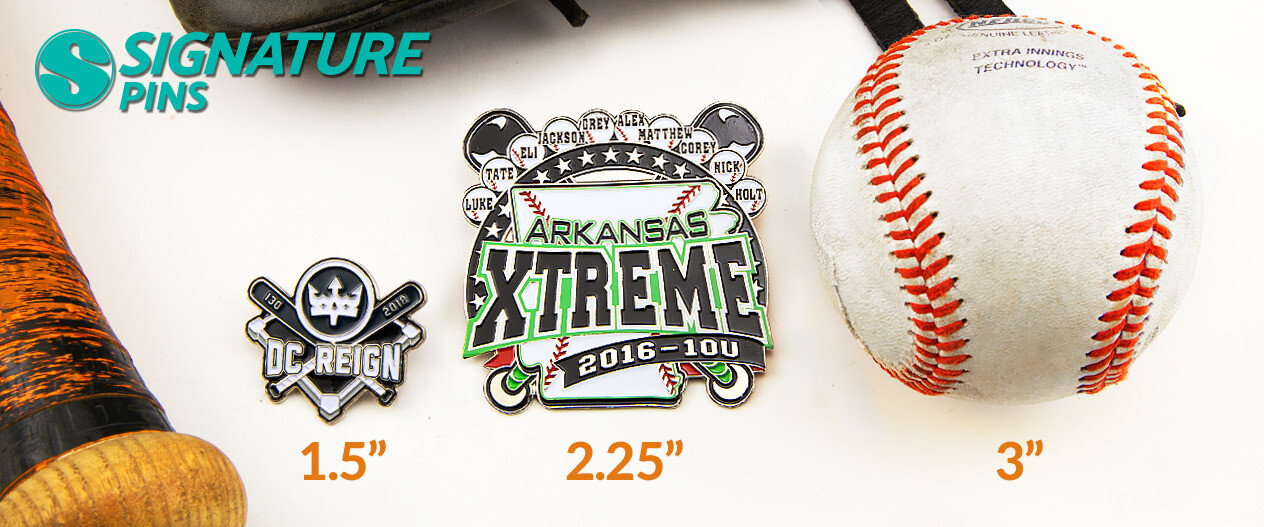 The average size for baseball trading pins is around 1.75”. Since more pins are made in this size than any other, sticking close to 1.75” will ensure your pin is the perfect size to entice most pin traders.