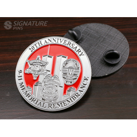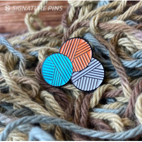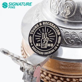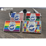 Soft Enamel pins are arguably the most recognizable process for making lapel pins. Its notable for its embossed look and feel. First a die stamp is created with your design. This die is used to strike your design into copper or iron base metal. If your design calls for it, we hand sandblast the pin to create the textured background. Enamel colors are then applied to the recessed areas based on your design. A syringe filled with paints is used to fill the wells created by the die stamping process. Your pins are than baked in a 350 degree oven to cure the enamel. A trim tool is than used to carefully cut out the outside shape of your lapel pin. The raised surface of your lapel pin is than polished to a mirror like finish.