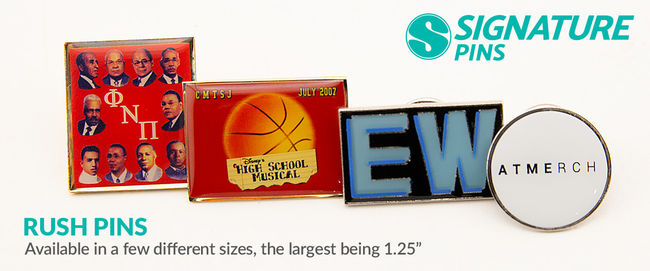 The size and shape of rush pins are customizable as well. Square, rectangular and circular pin shapes are available in a few different sizes. We chose these sizes because they’re the most common among custom lapel pins, and because no matter what kind of offset image a customer has in mind, one of these options will suit the design.