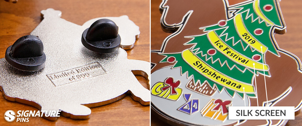 Screen printing allows our production team to add small, colorful details directly to the surface of the pin. In this case, it was the only way to create legible text that would fit in the center of the tree.