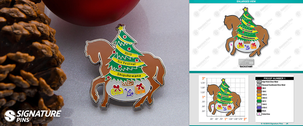 The contact on this project really wanted to capture the spirit of Shipshewana, which is why the design takes the shape of a brown horse. Shipshewana is well known for its horse-drawn carriages, and during the snowy winters, families make it a point to enjoy a nighttime sleigh ride through Main Street. Taking home a custom pin like this is a great way to commemorate the season and help the memories live on long after all the snow has melted away in spring.