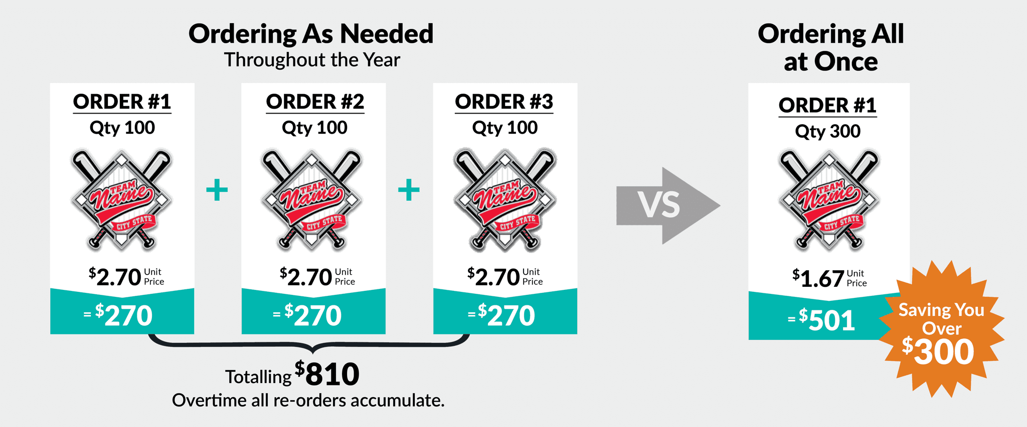 If you plan on reordering, you can save money by bulk ordering the first time, vs reordering throughout the year.